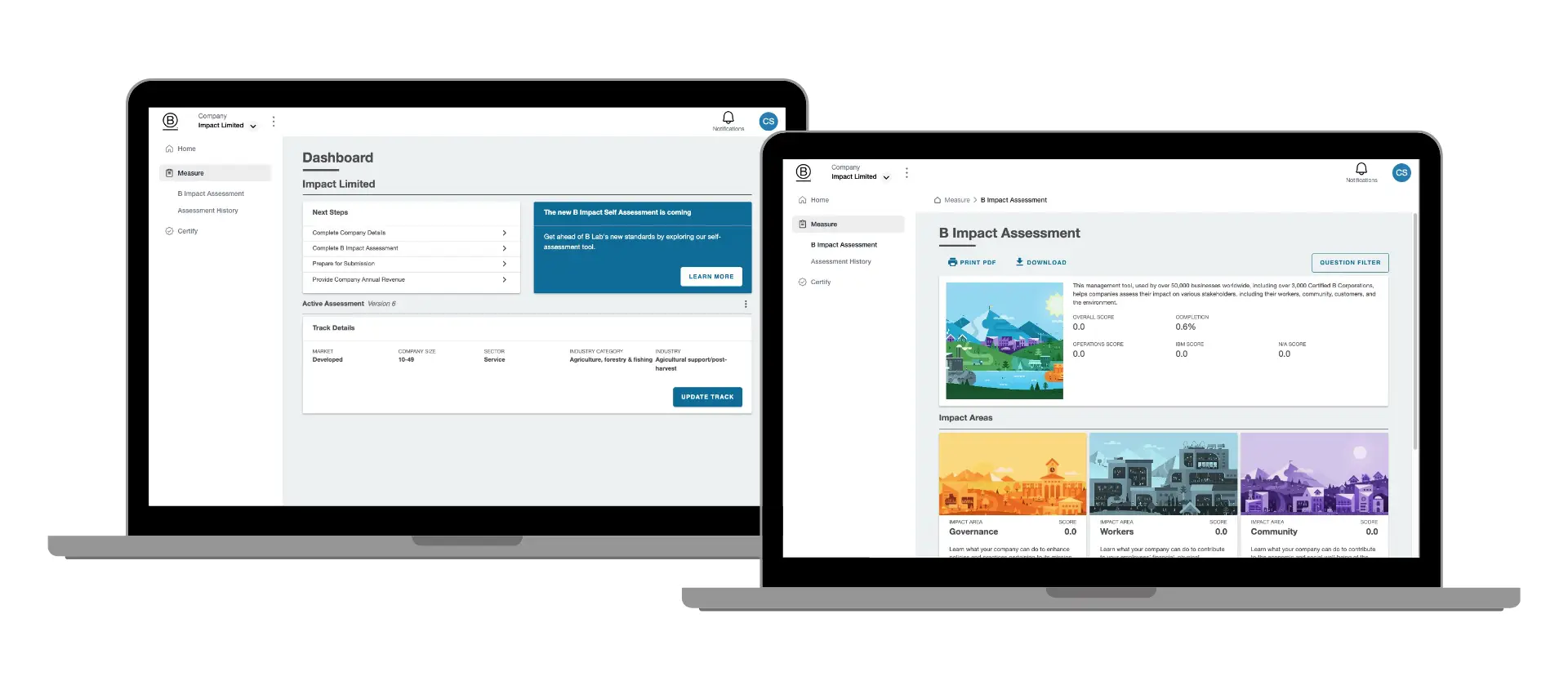B Impact is B Lab’s digital platform, designed to help businesses seamlessly measure, manage, and improve your company’s impact—all in one place. Whether you're working toward B Corp Certification, tracking progress against sustainability goals, or managing your company's social and environmental performance, B Impact provides the tools you need to drive meaningful change.